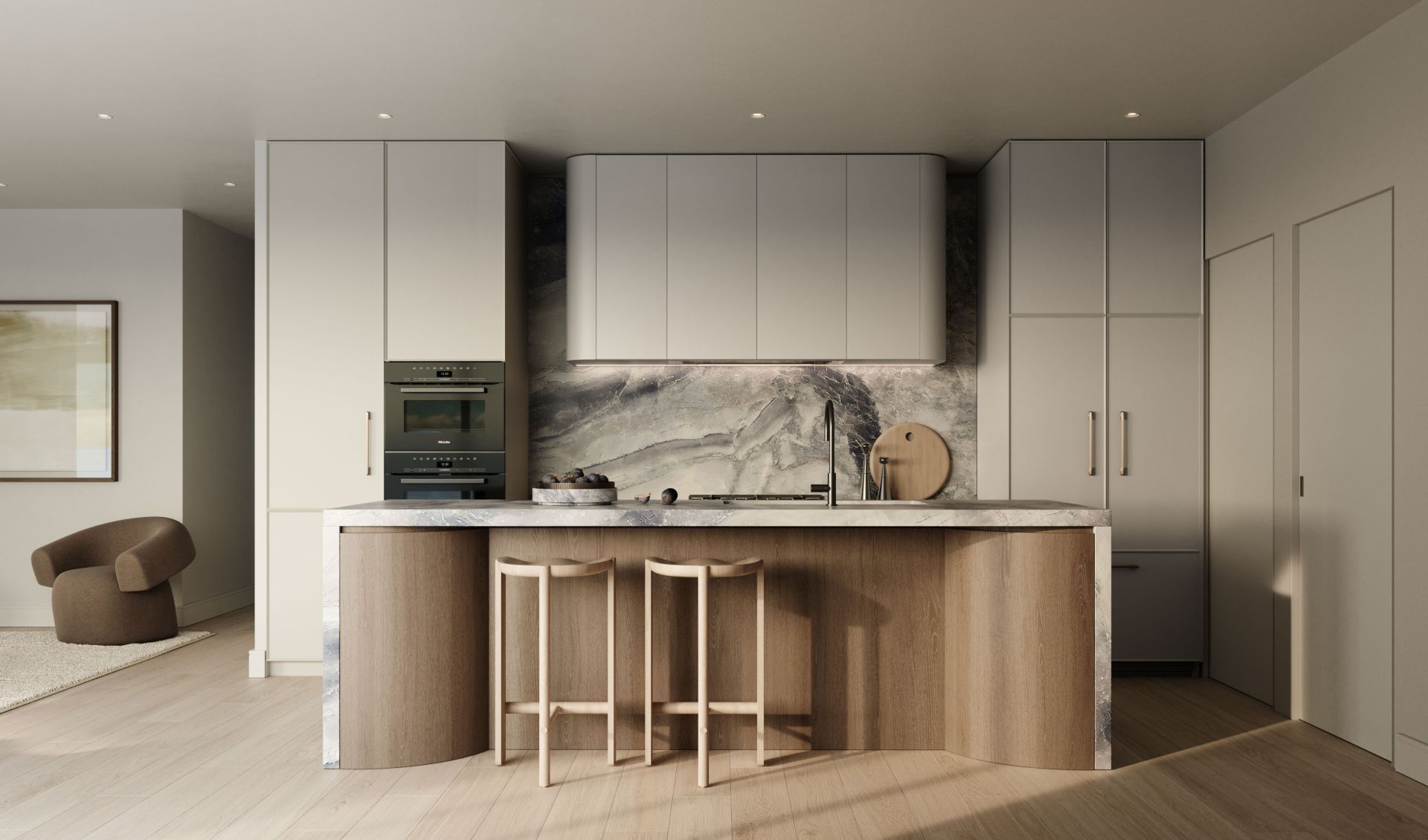 Every detail has been carefully curated, from luxurious stone benchtops with elegant curved finishes to premium Miele appliances-including a semi-integrated dishwasher and fully integrated rangehood-that bring both style and performance to the heart of the home.
