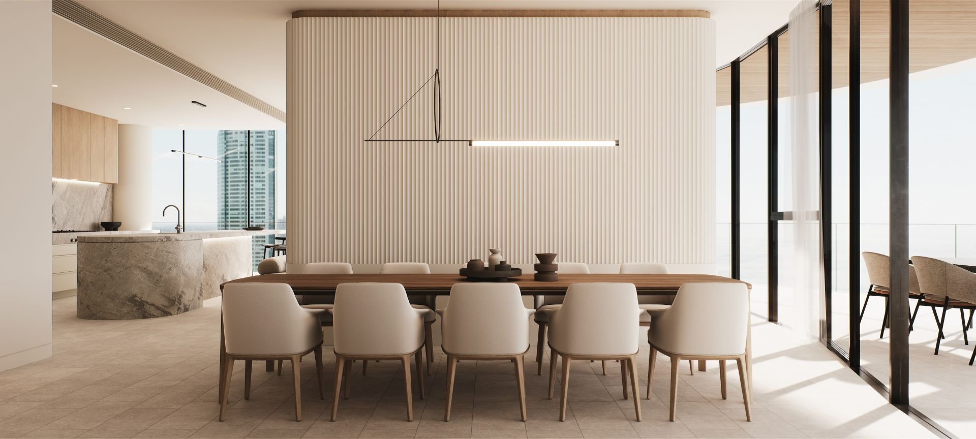 Floor to ceiling glass draws in light to reveal purity, elegance and the concentric natural shapes within every design element.