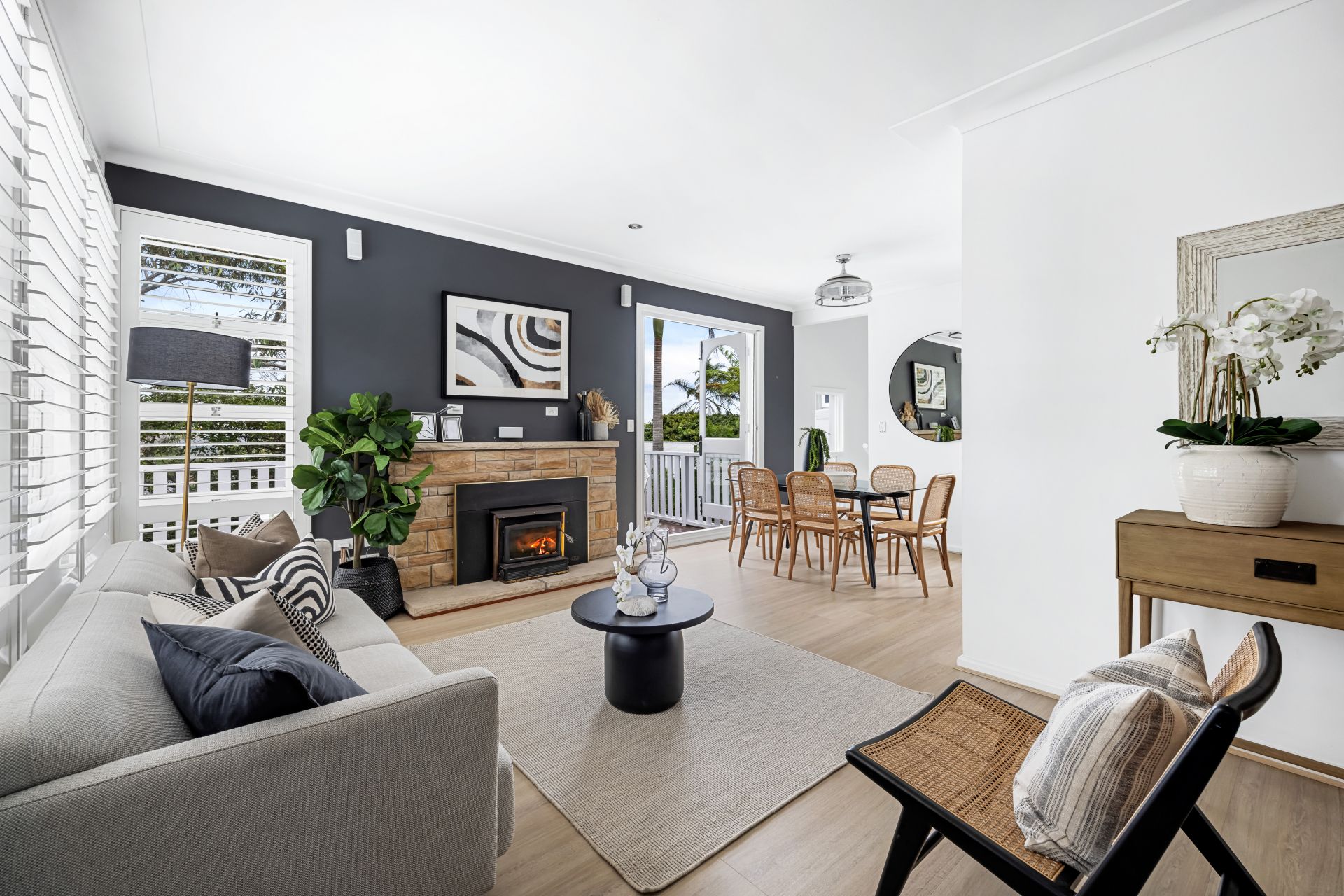 - Free-flowing living/dining area with fireplace opens to a private leafy balcony