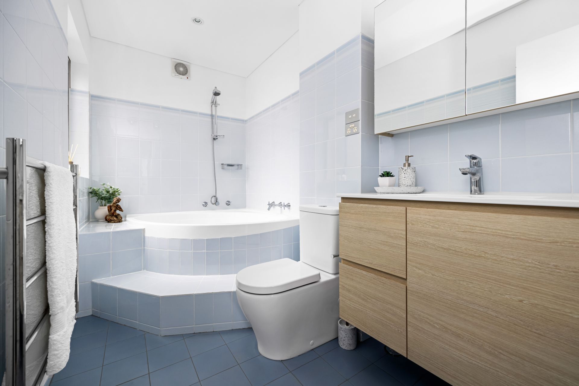 - Updated bathroom dressed in coastal themes with soaking bath
