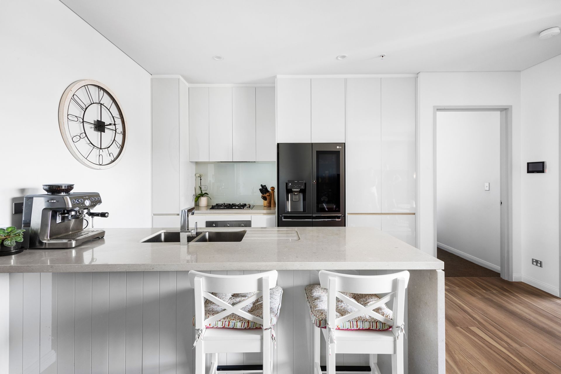 - Sleek open plan CaesarStone kitchen with a four-seat breakfast or cocktail bar