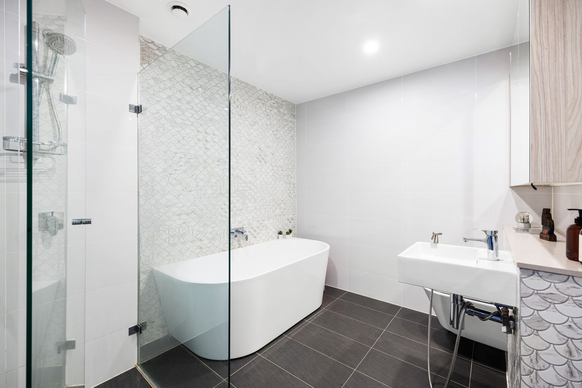 - Chic bathrooms, high ceilings, timber-look tiled flooring and ducted air con