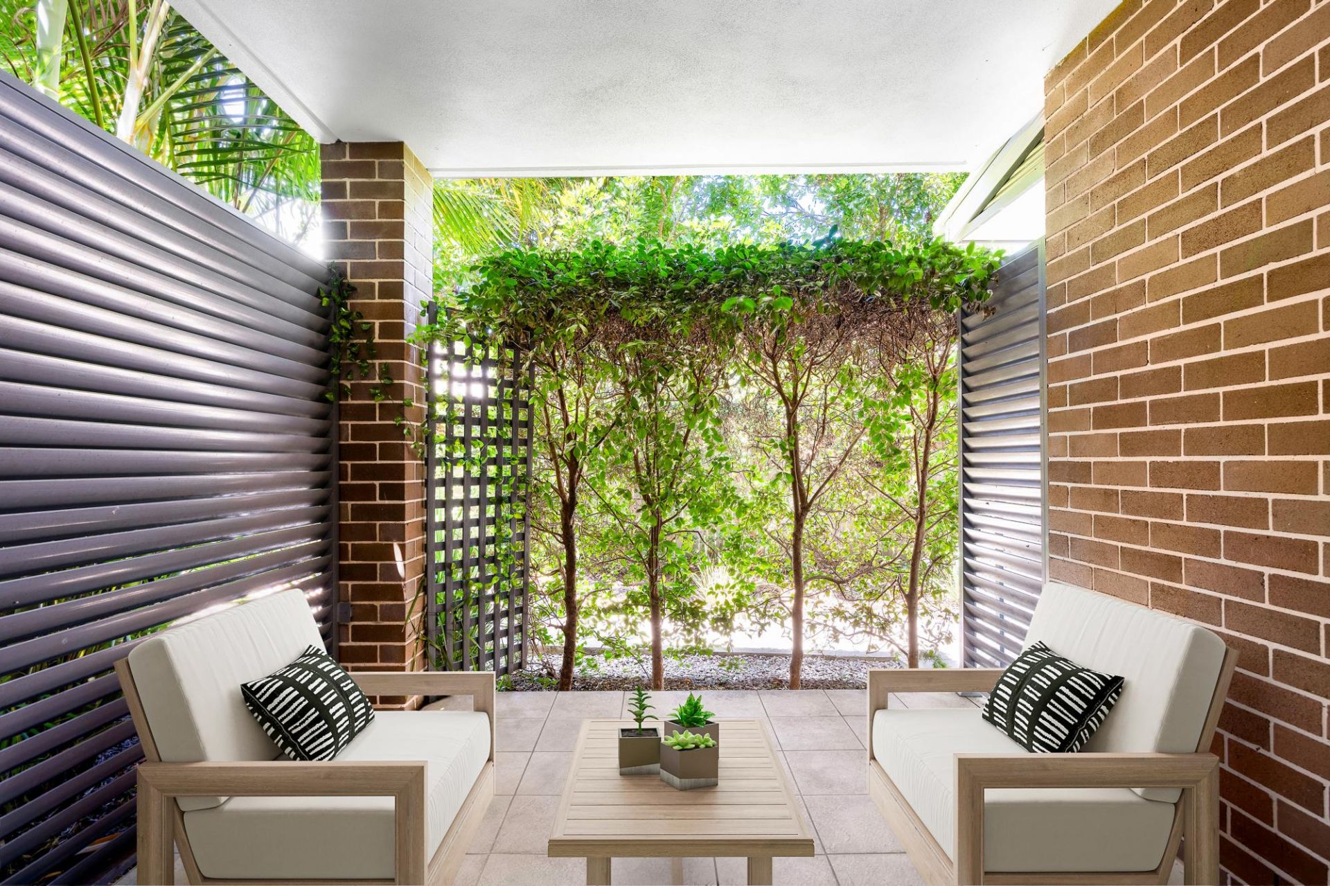 • A manicured hedge screens the large covered courtyard