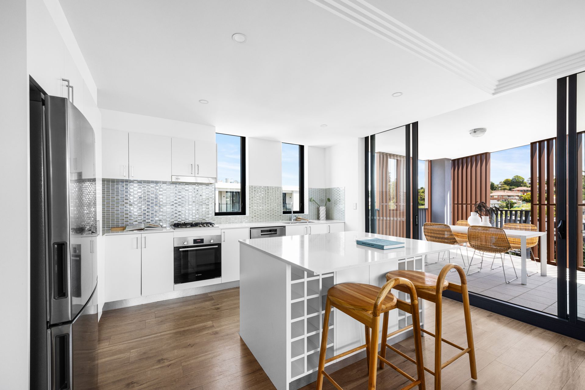 • Modern kitchen equipped with Bosch appliances, a large island perfect for entertaining, and seamless access to the outdoor covered balcony through expansive double sliding doors