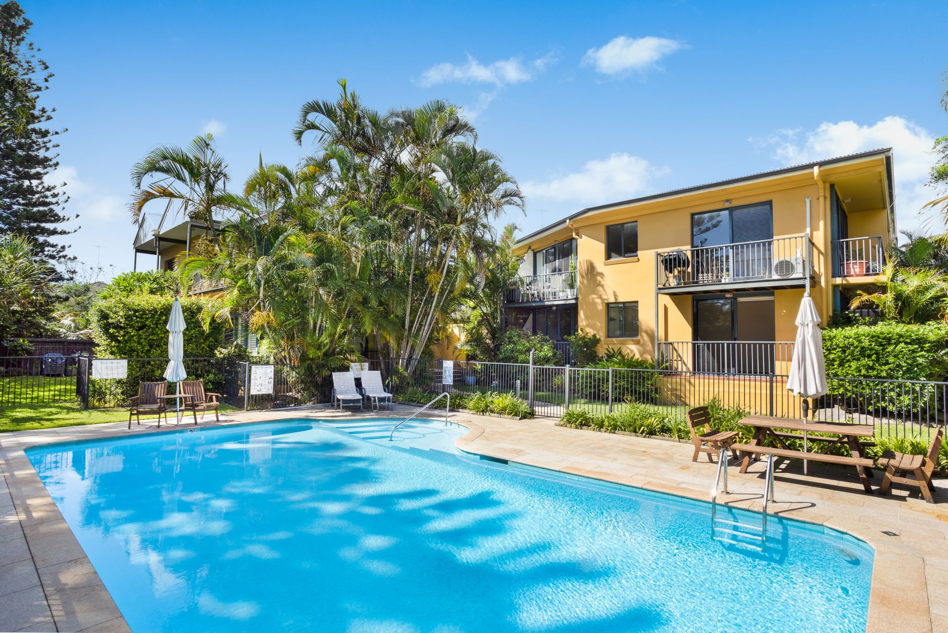 - Single parking space, secure building surrounded by tropical palms