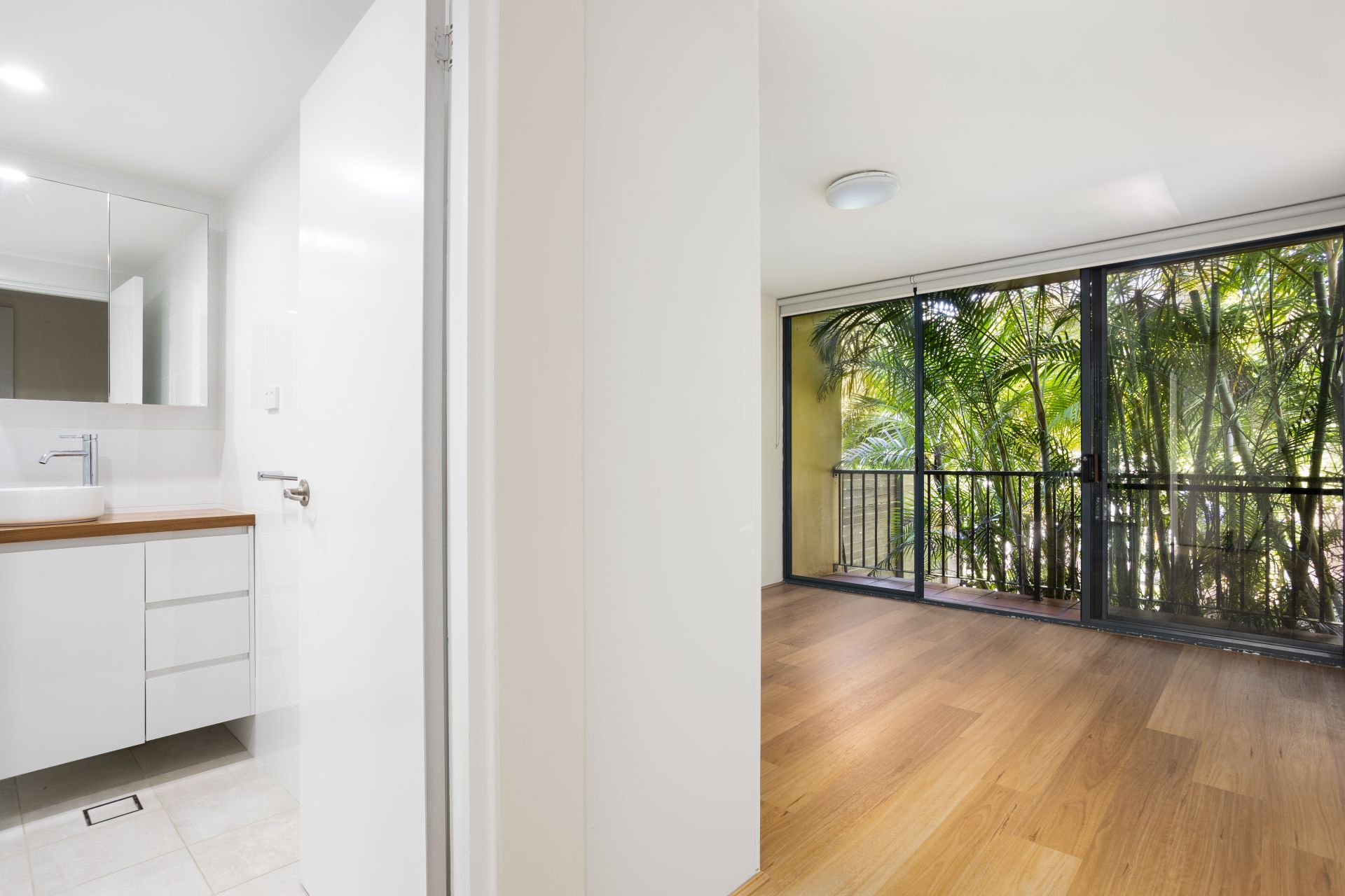 - Tidy ensuite bathroom with floor to ceiling tiles and timber vanity