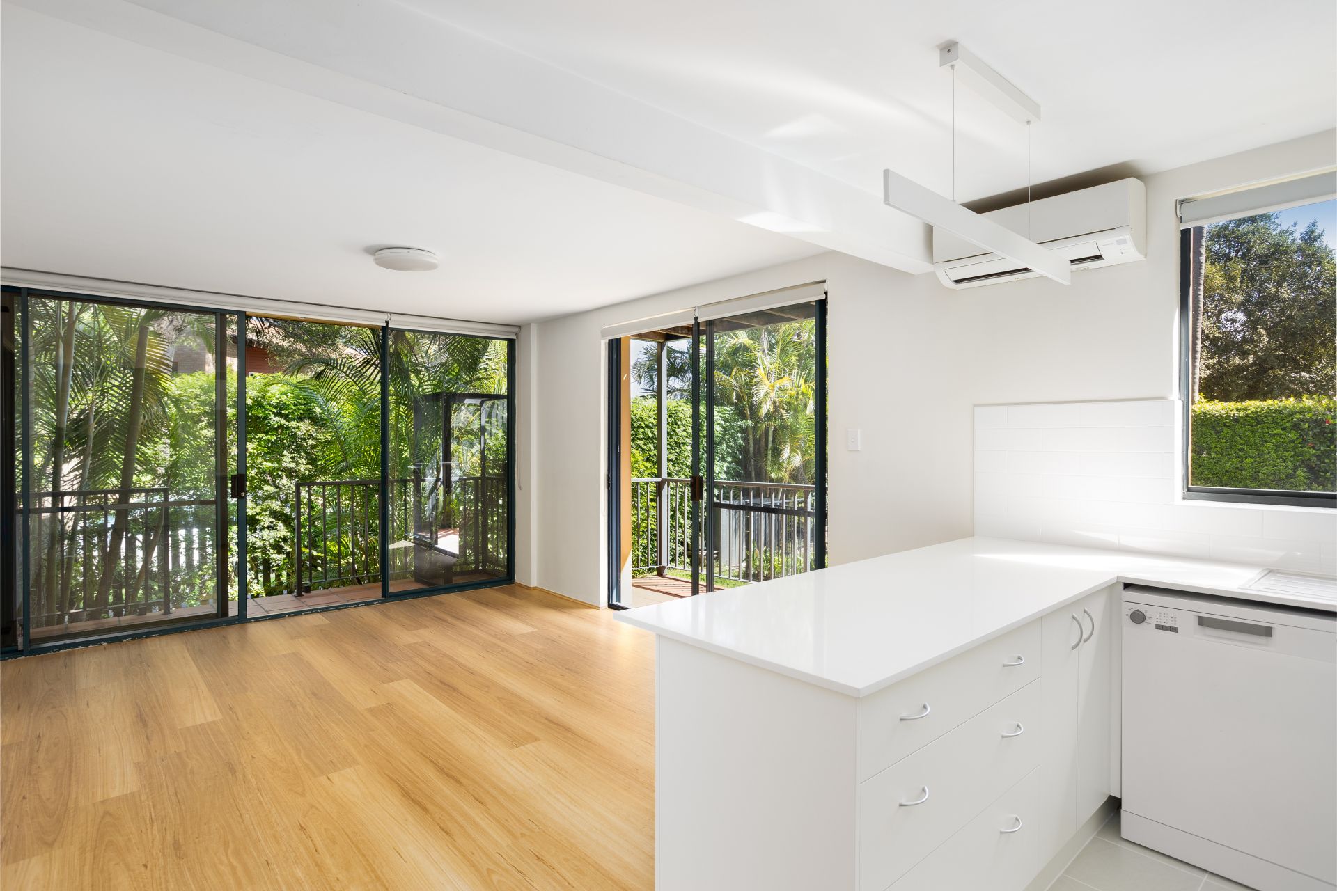 - Bright kitchen with white cabinetry, benchtops, and dishwasher