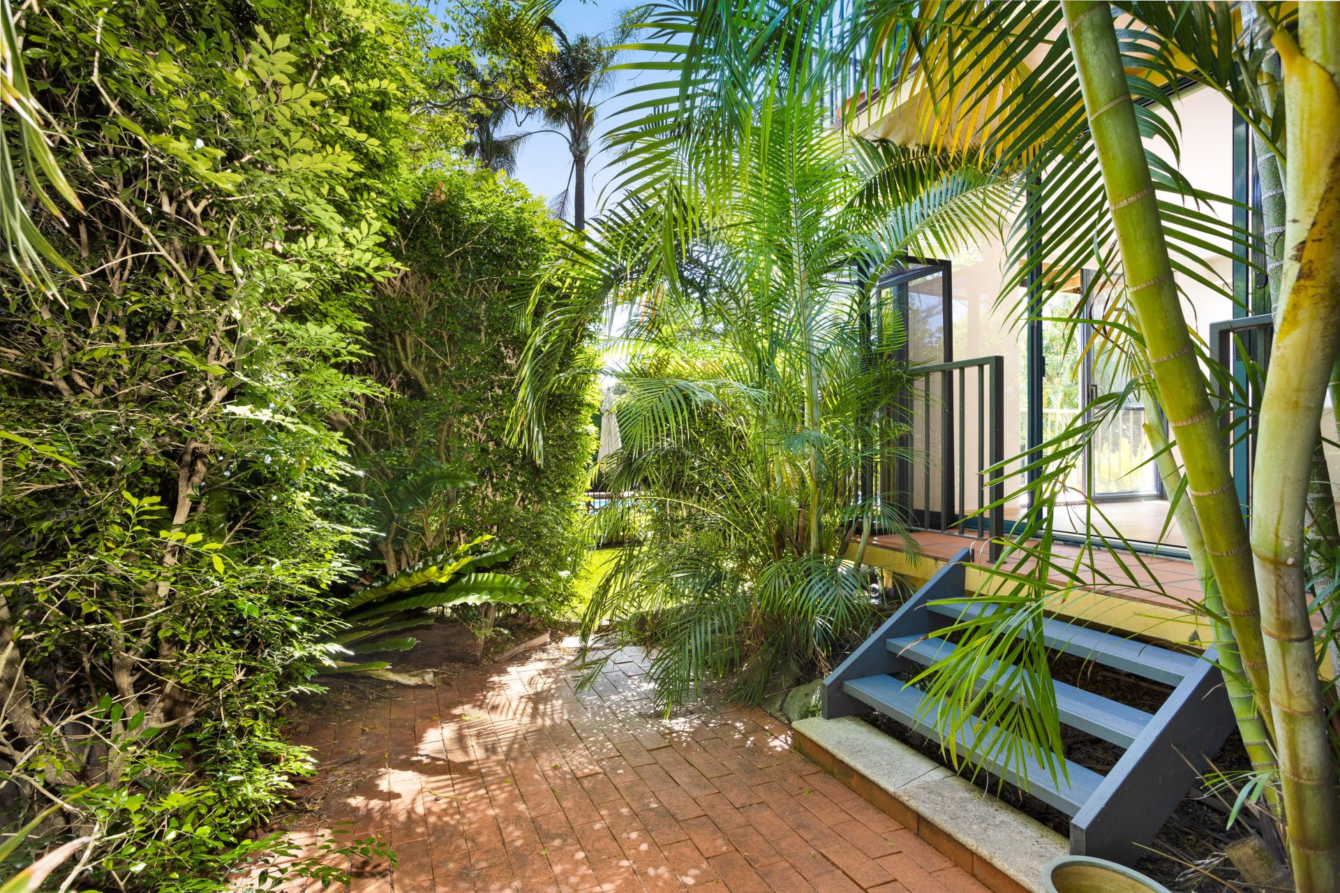 - Multiple glass doors frame serene pool views with private courtyard