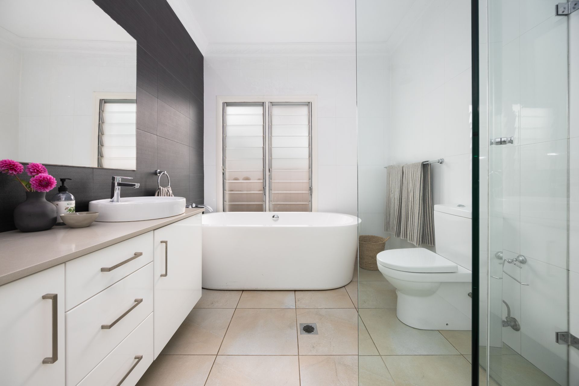 • Family bathroom – Luxurious double-basin vanity, frameless shower, and freestanding bathtub
