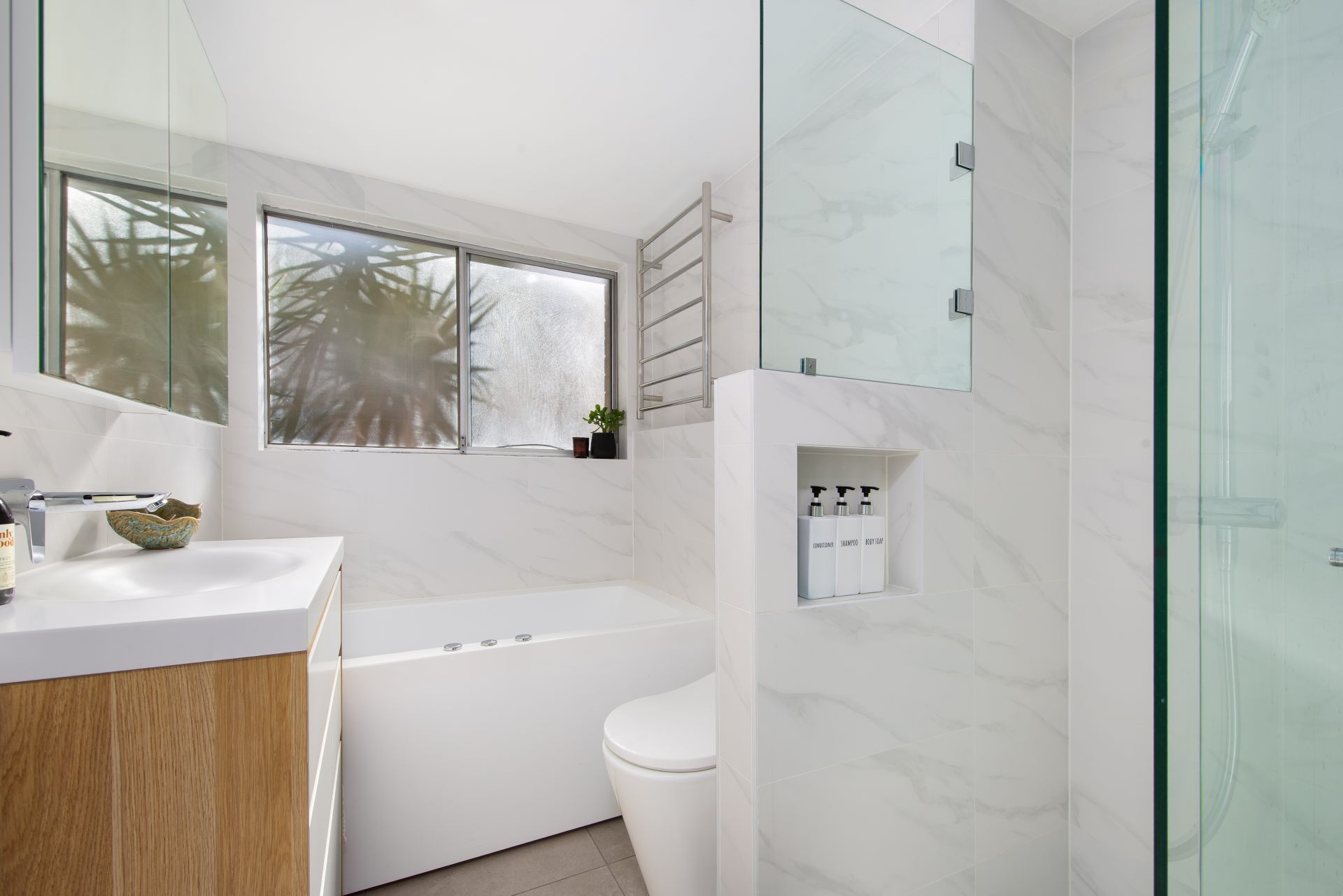 • Modern bathroom with spa bath, heat lamps, and stylish finishes