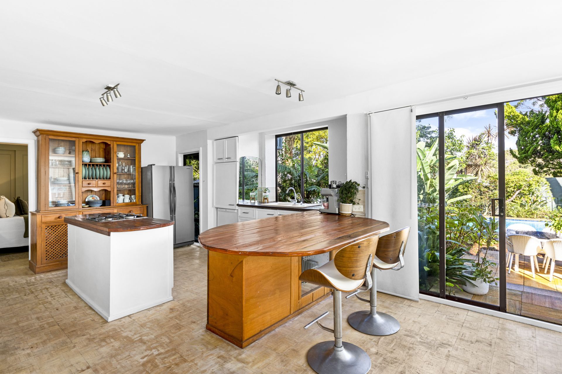 - Timber-benched island kitchen with a stool bar, gas cooktop and dishwasher