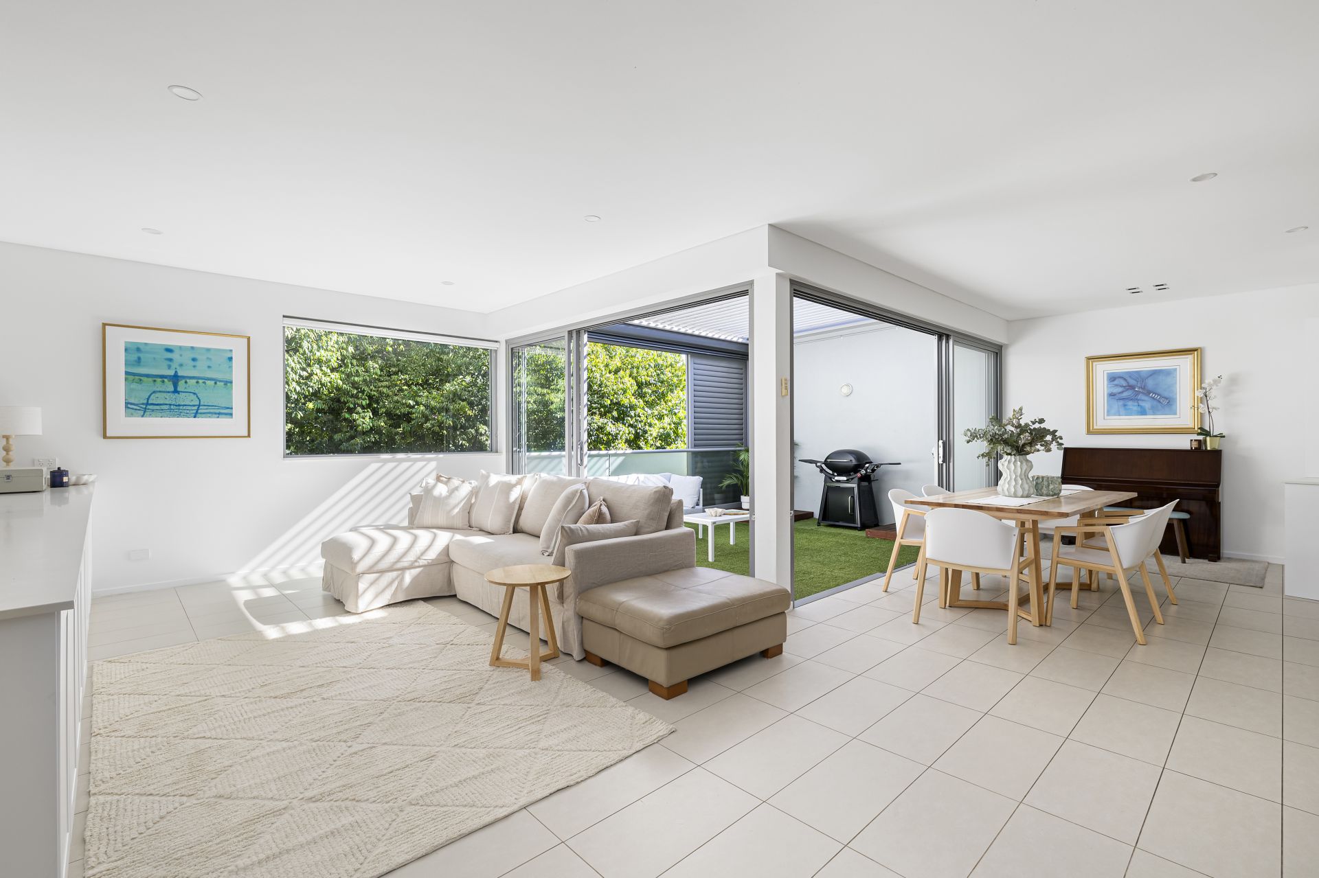The light-filled open plan layout flows to an oversized terrace with motorised louvre roof and blinds, perfect for relaxing or entertaining in any season. The designer kitchen features a stone island bench, Miele & Bosch appliances, gas cooking, and a walk-in pantry.