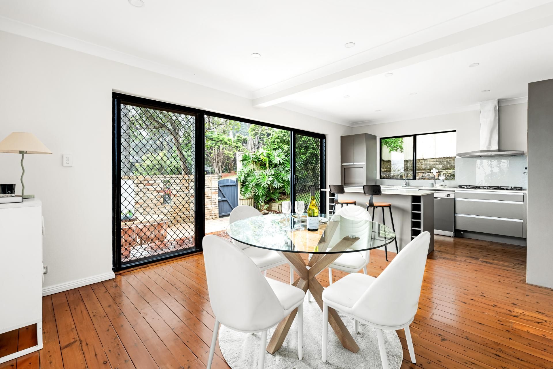 - Kitchen and dining areas extend to a sunlit terrace