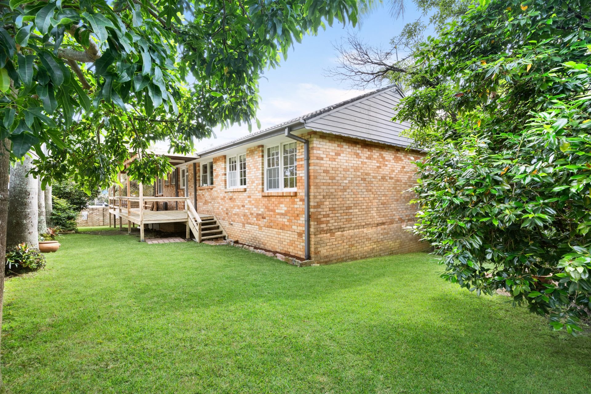 - Wooden deck overlooks wrap-around gardens and mature palms