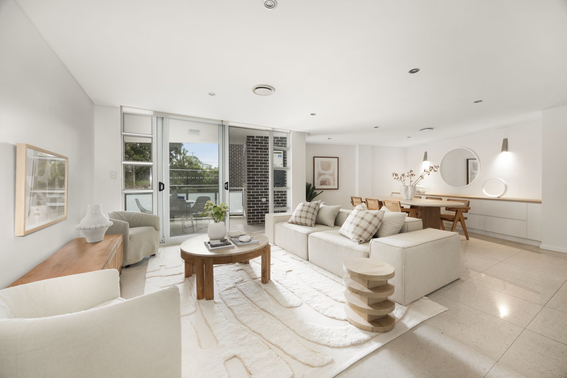 Open-plan kitchen, dining, and living areas seamlessly connect to a covered north balcony