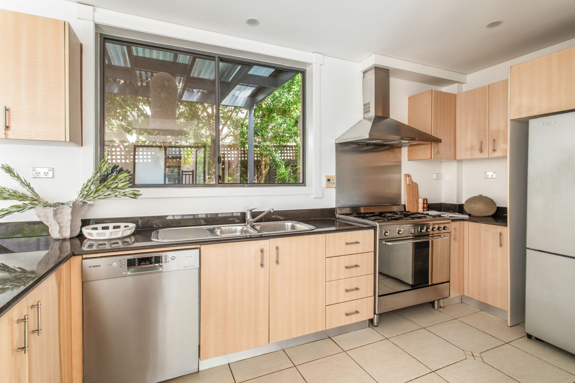 - Modern stone kitchen with Smeg gas cooktop with rangehood, Bosch dishwasher