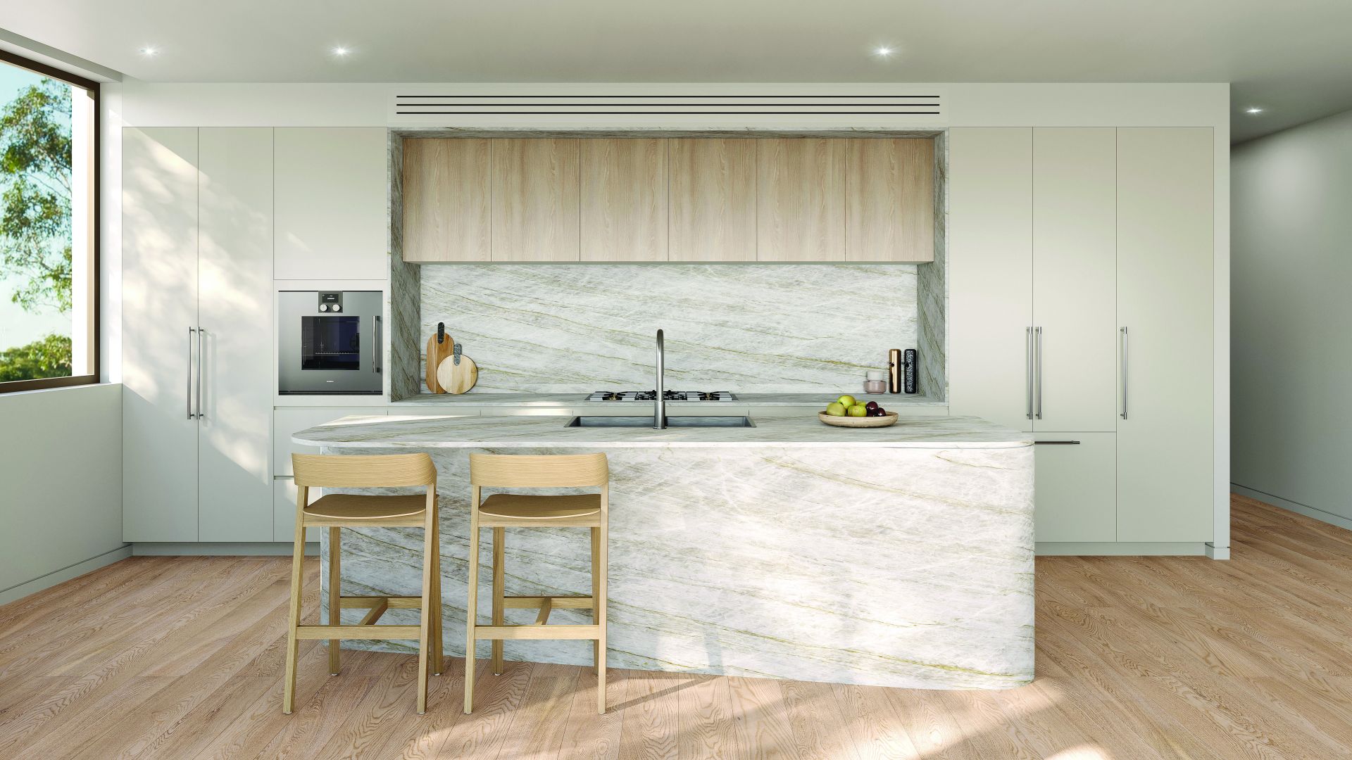 The heart of the home is the striking stone kitchen, showcased by a sculptural island bench and seamlessly integrated Gaggenau appliances-perfectly positioned for both everyday living and entertaining. Flowing effortlessly into the expansive open-plan living and dining areas, full-height glazing and high ceilings enhance the sense of space while capturing the relaxed coastal atmosphere reflected throughout the interiors.