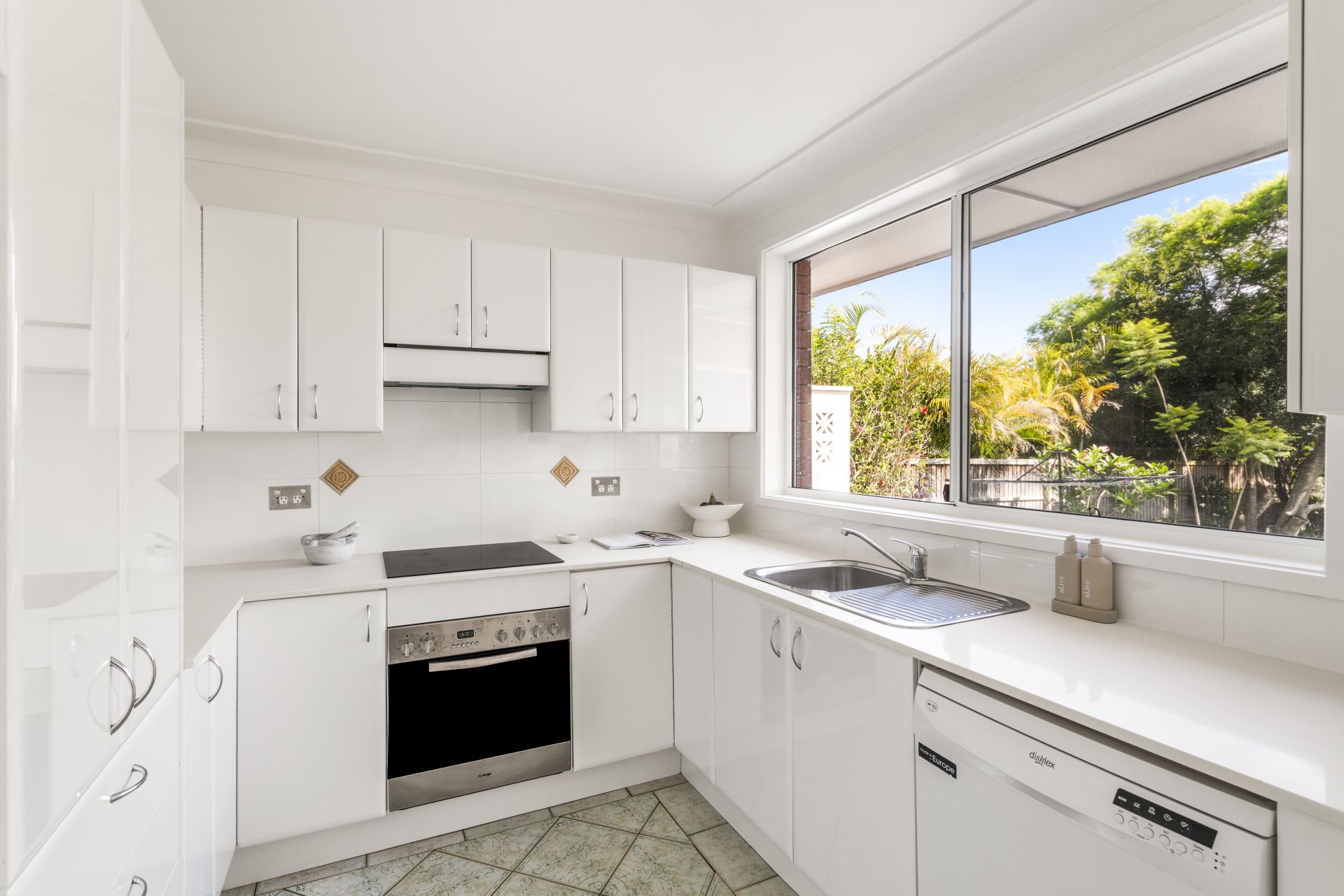 - Streamlined stone kitchen, electric cooktop, dishwasher and ample cupboard storage