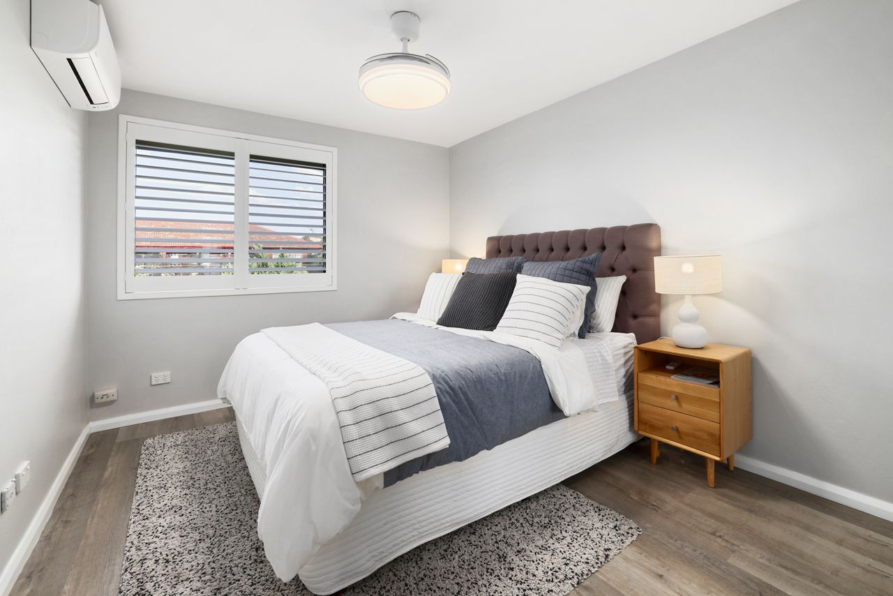 The main bedroom provides a serene escape, featuring air conditioning, elegant plantation shutters, and a built-in wardrobe for ample storage. The generously sized second bedroom offers flexibility, whether for guests or as a home office.