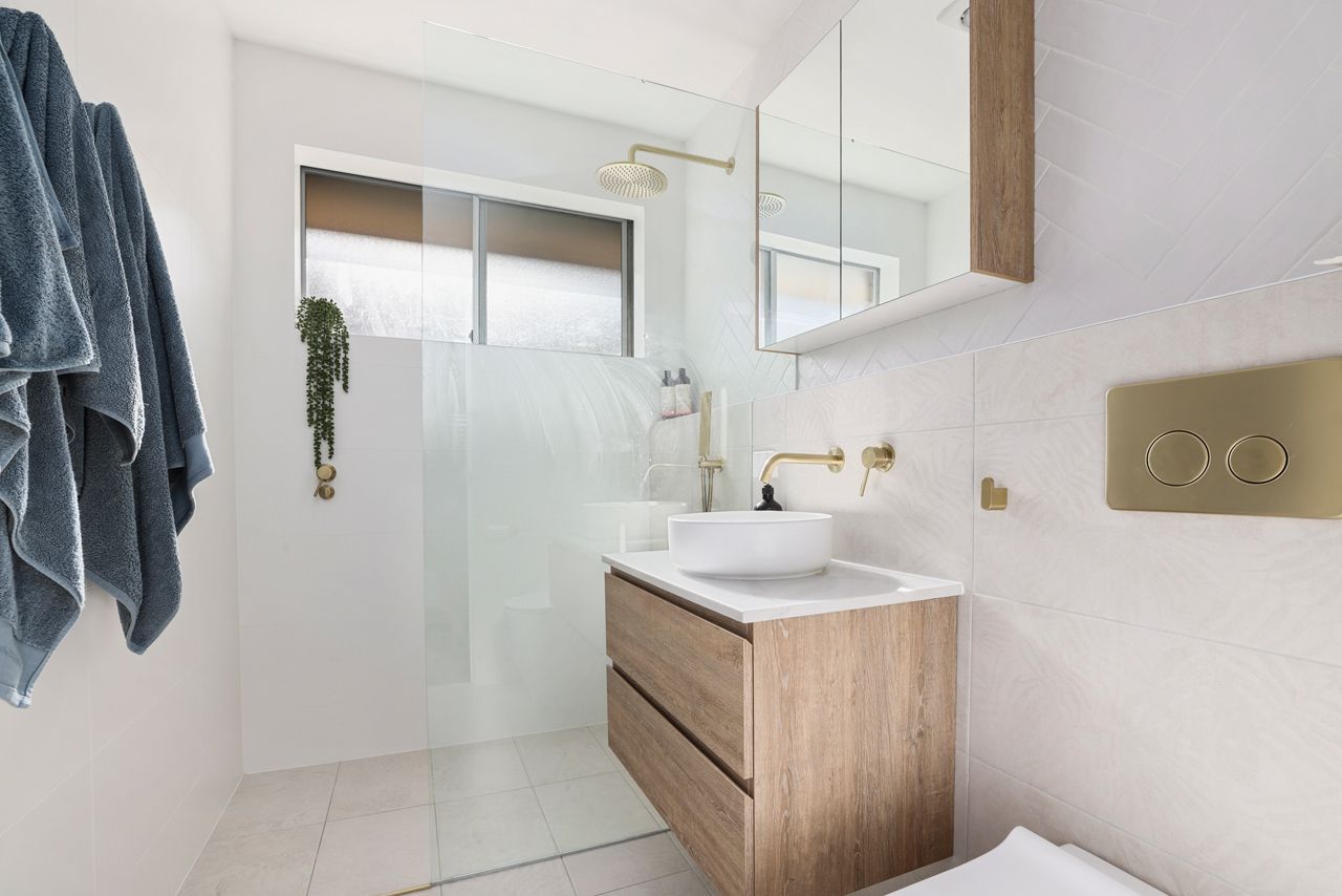 The modern bathroom is designed with luxurious gold finishes and plentiful storage, creating a perfect retreat for relaxation. A single lock-up garage ensures your vehicle is safely housed and conveniently accessible.
