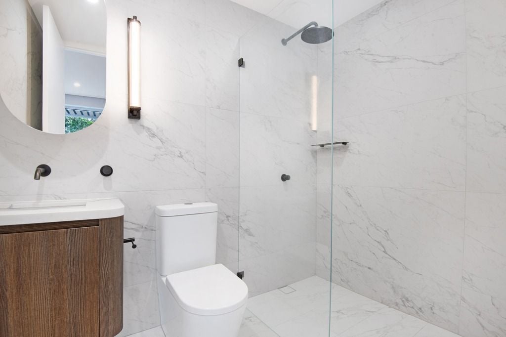 - Spa-inspired bathroom with Calcutta porcelain tiles and sleek fittings