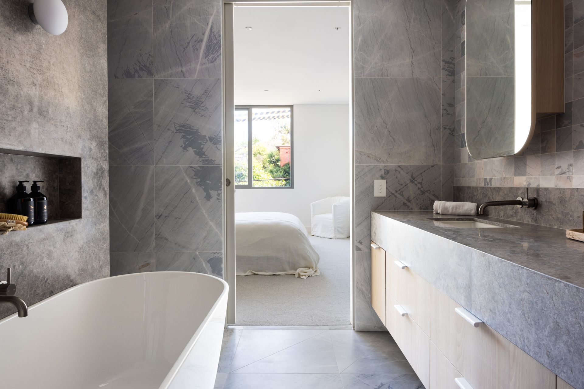 High ceilings enhance the sense of space, while open-plan living and dining zones extend to a private terrace, perfect for enjoying fresh sea air and relaxed entertaining. The designer kitchen features Miele appliances, Palazzo stone benchtops and custom cabinetry, while both bathrooms deliver hotel-style luxury with premium finishes, heated towel rails and a statement freestanding bath.
